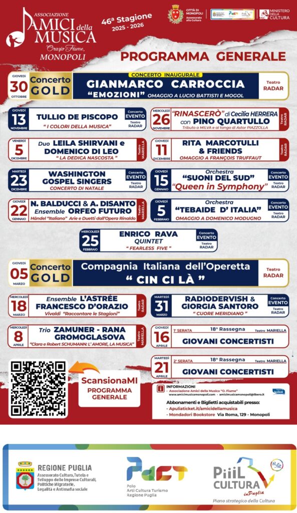 Giovedì 30 ottobre 2025 Teatro “Radar” (Concerto Gold)ore 21:00 GIANMARCO CARROCCIA Emozioni – Omaggio a LUCIO BATTISTI e MOGOL Gianmarco CARROCCIA – voce Marco CATALDI – arrangiamenti e chitarre...